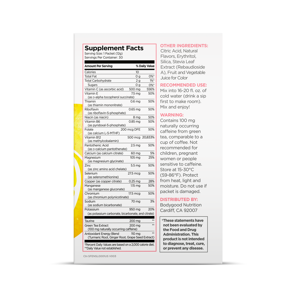 Serving Size: 1 Packet (12g), Amount Per Serving: Calories 25, Total Fat 0g (0% DV), Total Carbohydrate 2g (1% DV), Vitamin C (ascorbic acid) 500mg (556% DV), Vitamin E (D-alpha tocopherol succinate) 7.5mg (50% DV), Thiamin (thiamin mononitrate) 0.6mg (50% DV), Riboflavin (riboflavin-5-phosphate) 0.65mg (50% DV), Niacin (niacin) 8mg (50% DV), Vitamin B6 (pyridoxal-5-phosphate) 0.85mg (50% DV), Folate (calcium L-5-MTHF) 200mcg DFE (50% DV), B12 (methlycobalamin) 500mcg (20,833% DV), Pantothenic Acid (D-calcium pantothenate) 2.5mg (50% DV), Calcium (calcium citrate) 60mg (5% DV), Magnesium (magnesium glycinate) 105mg (25% DV), Zinc (zinc amino acid chelate) 5.5mg (50% DV), Selenium (selenomethionine) 27.5mcg (50% DV), Copper (copper citrate) 0.25mg (28% DV), Manganese (manganese gluconate) 1.15mg (50% DV), Chromium (chromium polynicotinate) 17.5mcg (50% DV), Sodium (sodium bicarbonate) 70mg (3% DV), Potassium (potassium carbonate, bicarbonate and citrate) 950mg (20% DV), Taurine 200mg, Green Tea Extract (100mg naturally occurring caffeine) 200mg, Antioxidant Energy Blend (Turmeric Root, Ginger Root, Grape Seed Extract) 110mg.