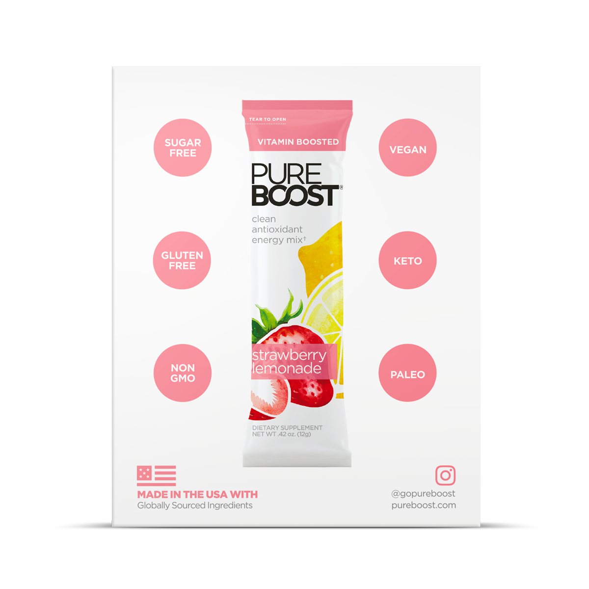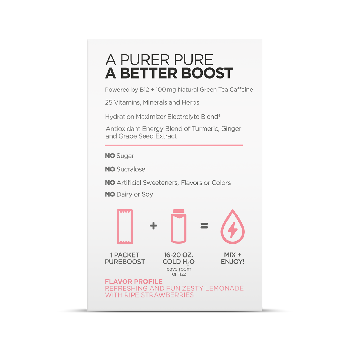 Refreshing and fun zesty lemonade with ripe strawberries. Clean, powerful energy + essential vitamins. No sugar, no sucralose, no crash.